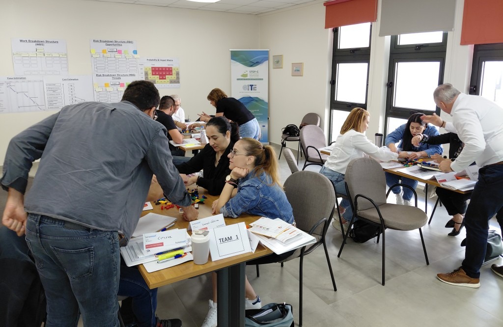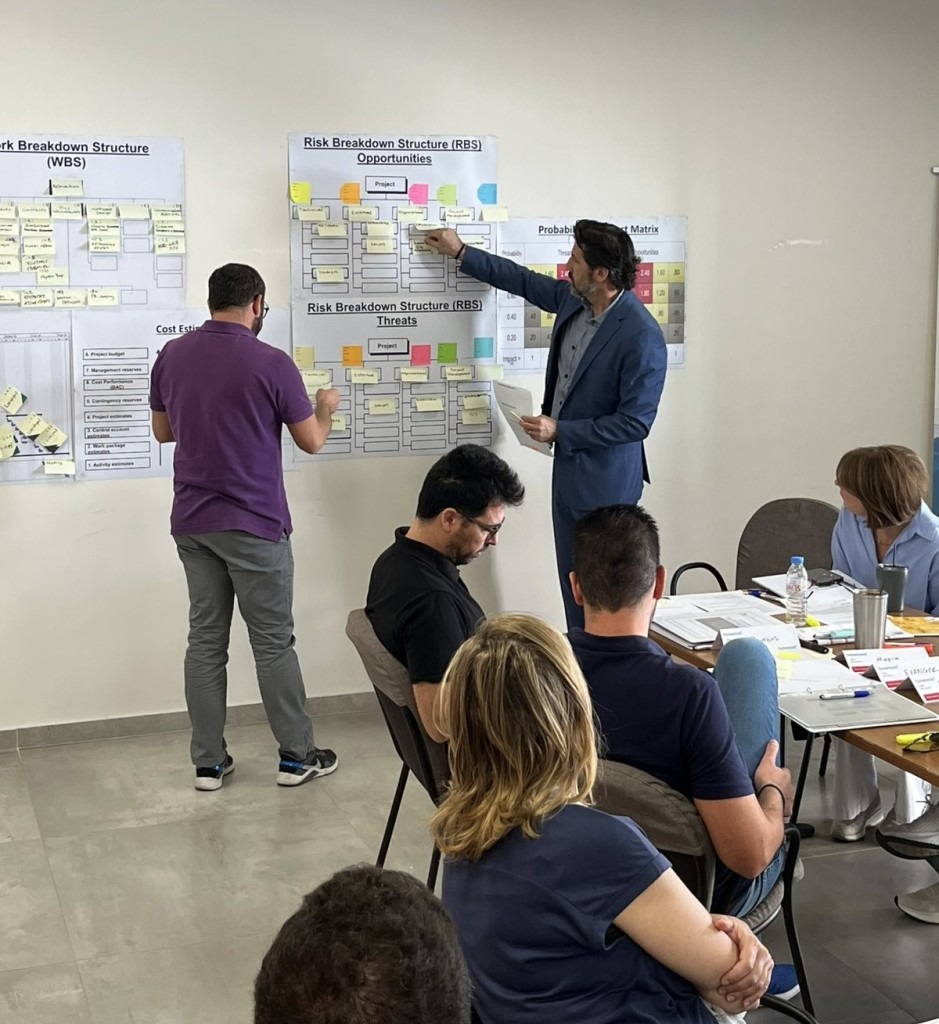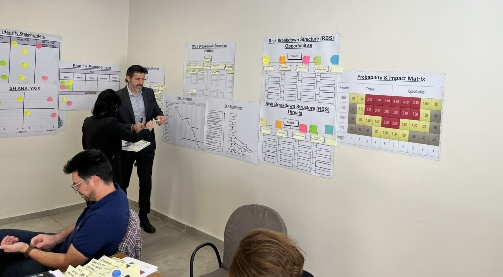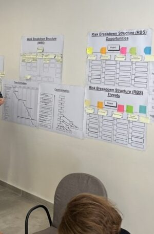 The training began with a team-building activity and an introduction to the Initiating phase. During the Planning phase, participants identified project stakeholders, defined project objectives using the Project Triangle, and developed key PM² Artefacts. In the Execution phase, the team tackled a Change Request scenario and explored how to manage it effectively using Monitoring and Controlling tools, without disrupting project progress.